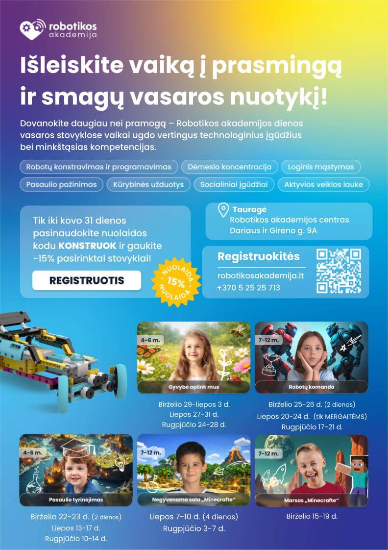 Artėjant vasaros atostogoms kviečiame jau dabar pagalvoti, kaip vaikai praleis laisvalaikį po mokslo metų. Vasaros stovyklos – puiki galimybė vaikams ne tik smagiai leisti laiką, bet tobulinti socialinius įgūdžius, stiprinti savarankiškumą, bei patirti daug įsimintinų nuotykių.