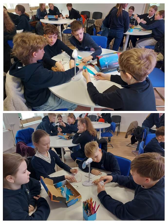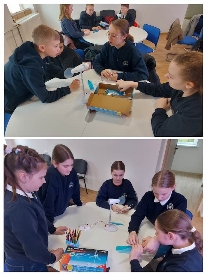 informaciją apie atsinaujinančius energijos šaltinius vaikai patys sukonstravo vėjo jėgainių modeliukus.