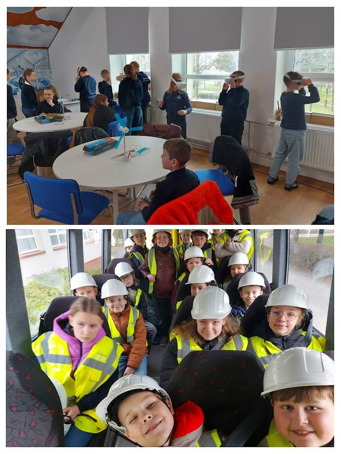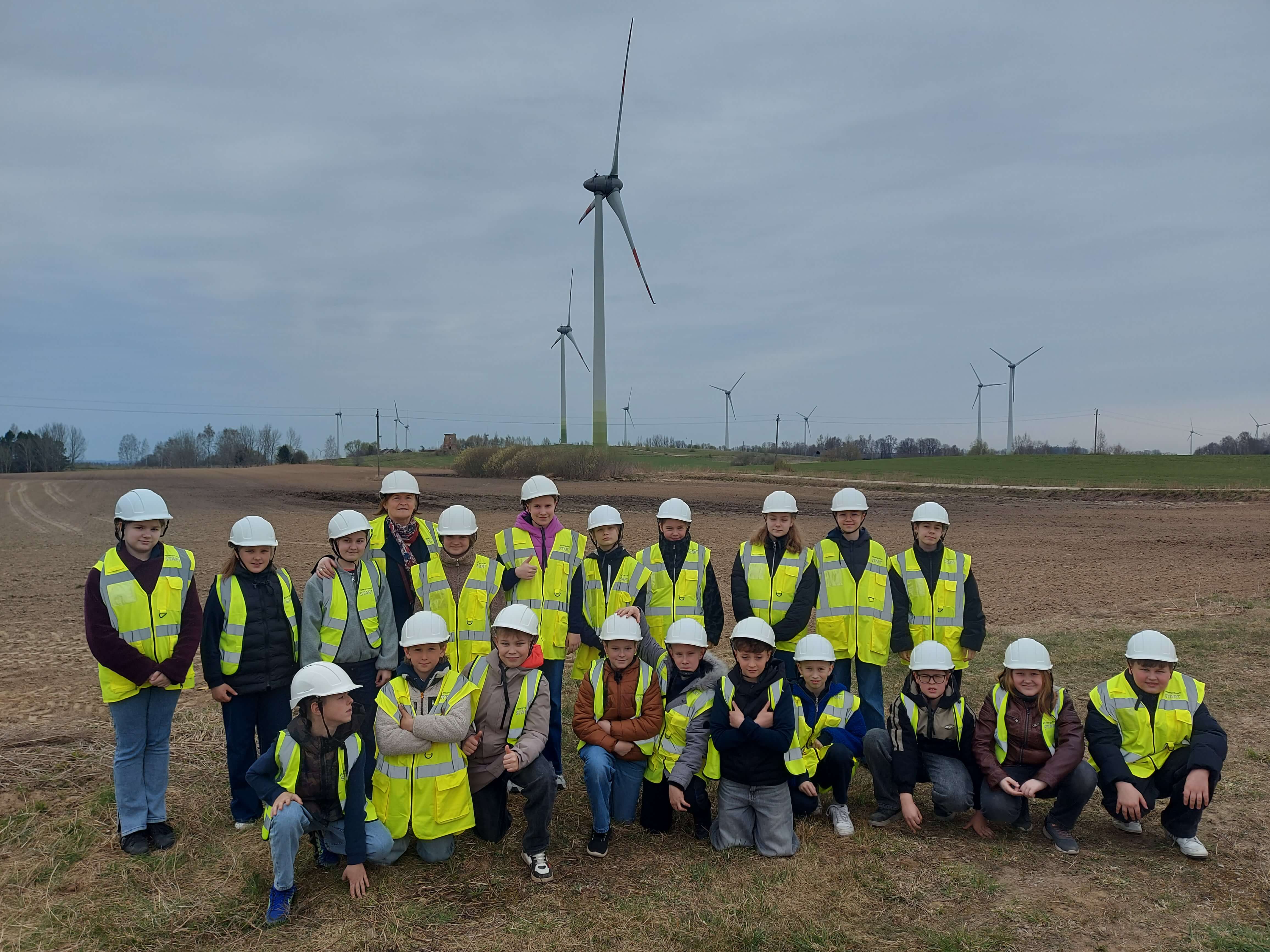 viršų. Paskui vaikai pasipuošę ryškiomis liemenėmis ir apsauginiais šalmais nuvyko iki vėjo jėgainių parko.