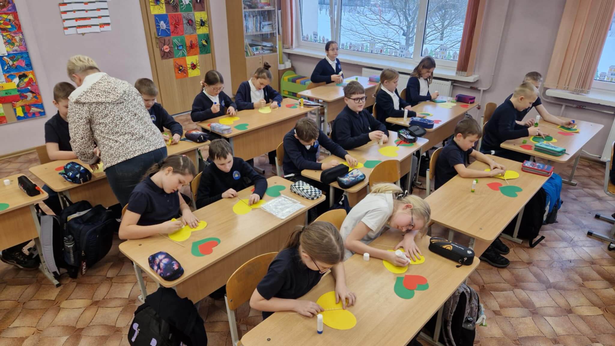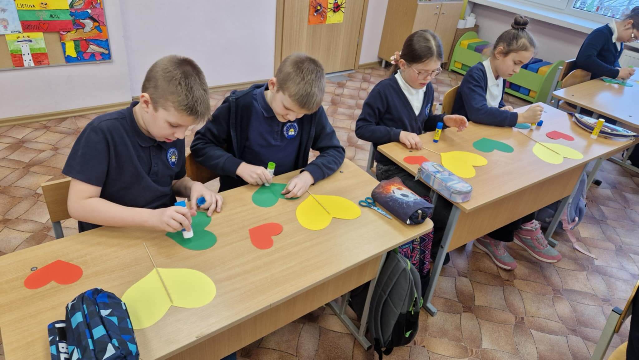 Kūrybinė pamokos dalis tapo tikra spalvų švente. Mokiniai pasidarė trispalves širdeles –
